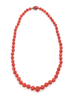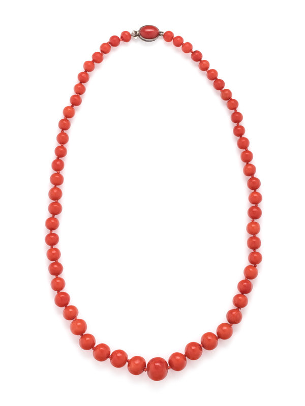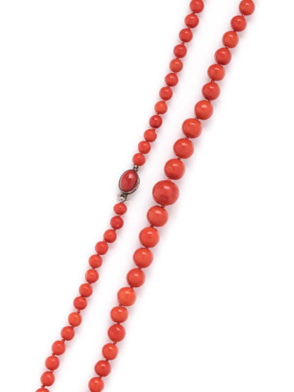 Containing graduating coral beads measuring approximately 5.55-11.50 mm in diameter, strung knotted with a silver clasp containing one oval cabochon coral. 17 inches long.