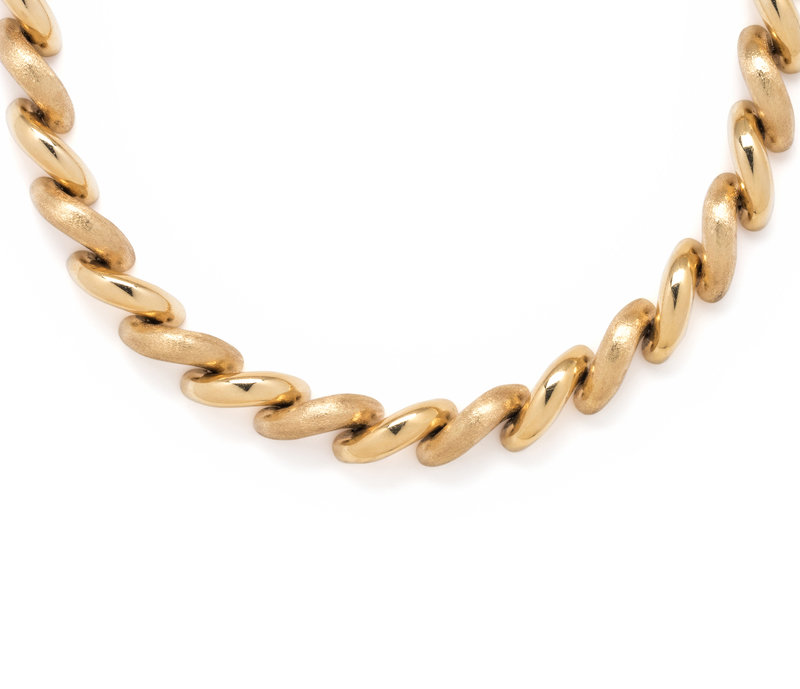 Consisting of an alternating brushed and polished San Marco link chain measuring approximately 11.00 mm wide. 16 inches long.