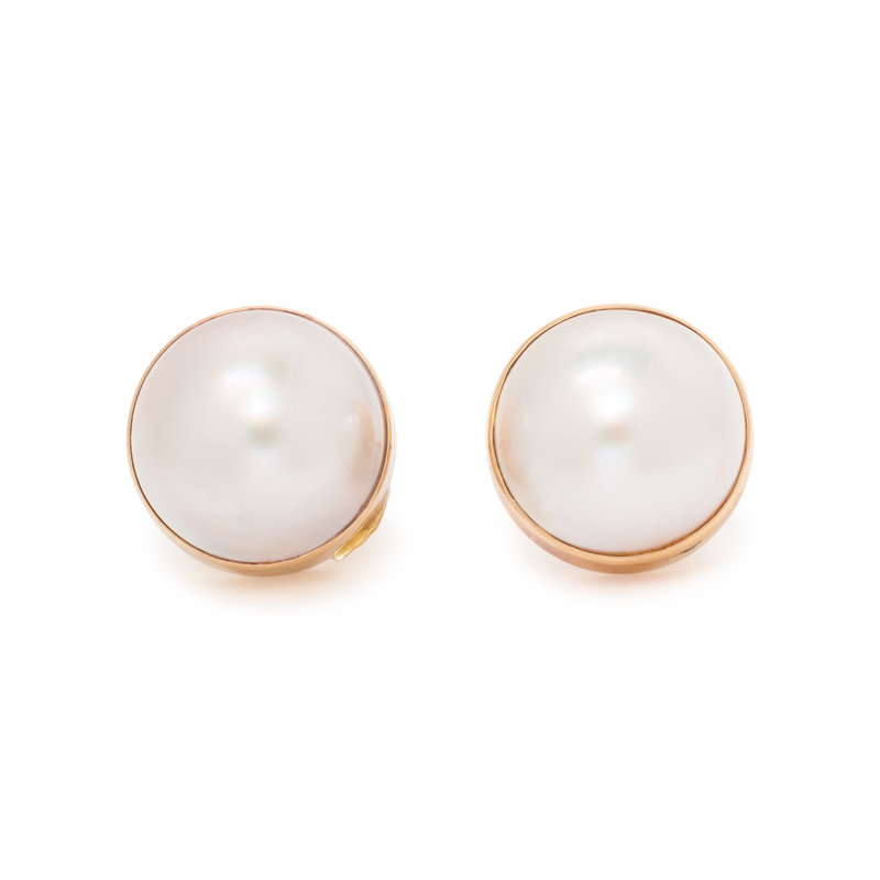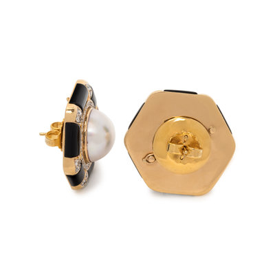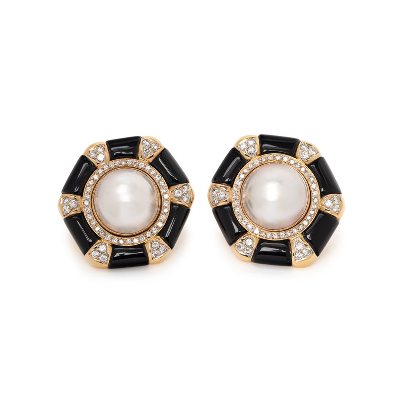 Consisting of a pair of studs containing two mabe pearls measuring approximately 14.90 mm in diameter, with removable jackets containing numerous round brilliant cut diamonds weighing approximately 0.90 carat total and black enamel sections. 1 1/8 inches long with jackets.