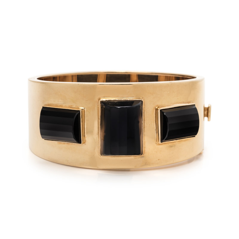 Containing three rectangular domed and faceted onyx plaques, hinged with side clasp. 7 inches inner circumference.