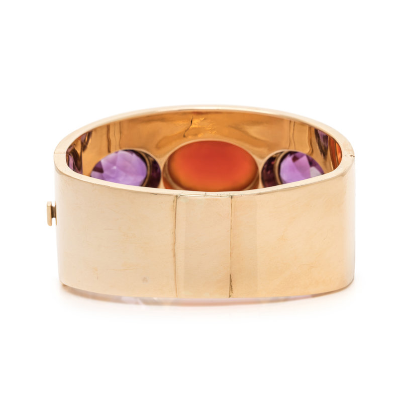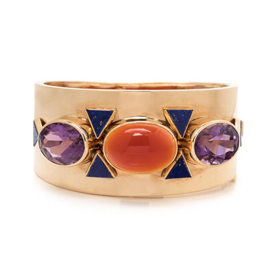Containing one oval cabochon carnelian measuring approximately 24.00 x 17.00 mm, two oval cabochon amethysts and six triangular shaped lapis lazuli. 7 inches inner circumference.