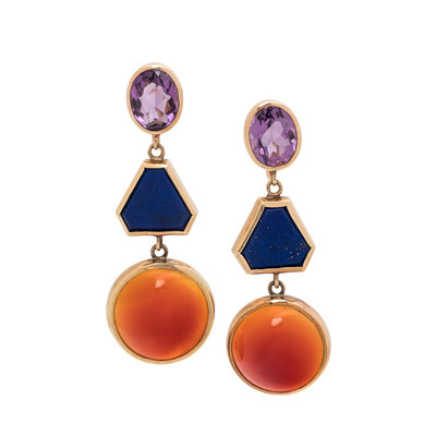 Containing two oval mixed cut amethysts, two calf's head shaped lapis lazuli and two round cabochon carnelians, with screw backs. 1 3/4 inches long.