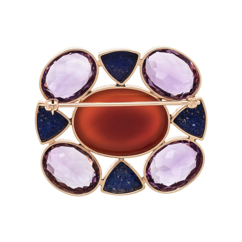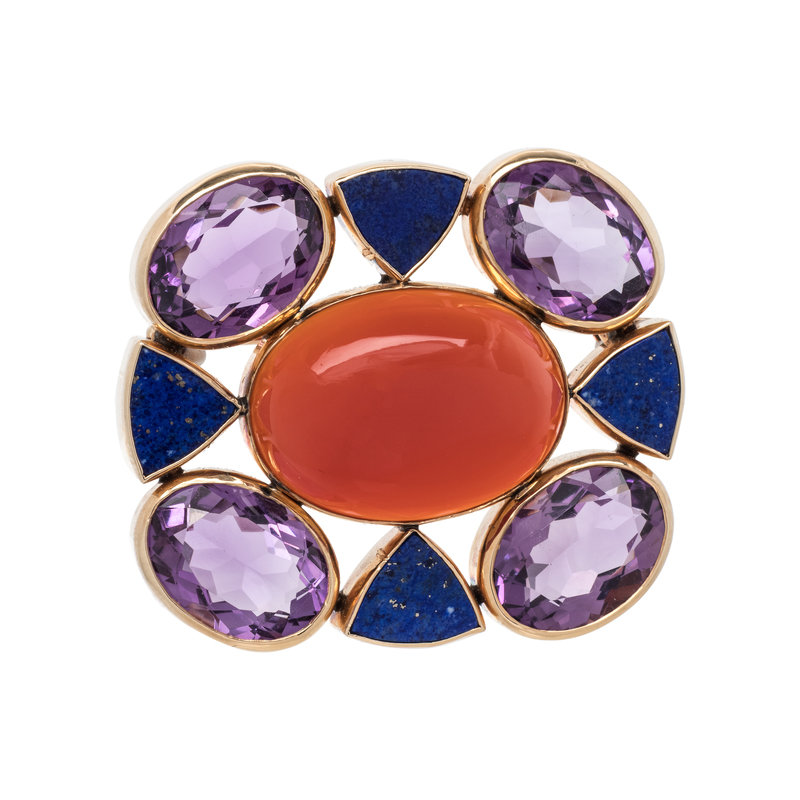 Containing one oval cabochon carnelian measuring approximately 24.00 x 17.00 mm, four oval mixed cut amethyst and four triangular shaped lapis lazuli. 1 7/16 x 1 11/16 inches.