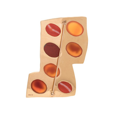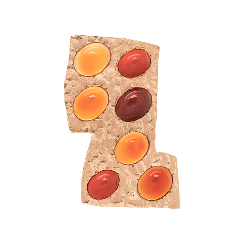 Containing four oval cabochon carnelian, two oval cabochon coral and one oval cabochon jasper, in a geometric style setting in a hammered finish. 2 1/4 x 3 inches.