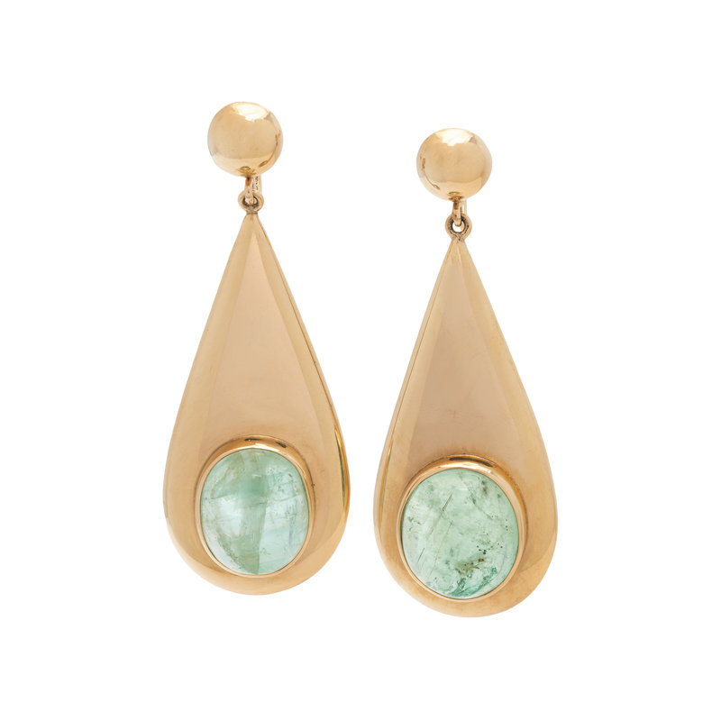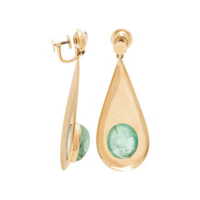 Consisting of pear shaped drop earclips containing two oval cabochon green beryls, with screw backs. 2 1/2 inches long.