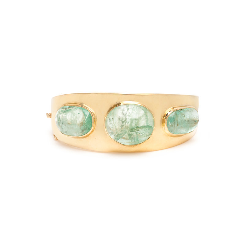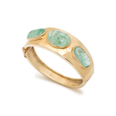 Containing three tumbled green beryls, hinged with side clasp. 7 1/4 inches inner circumference.