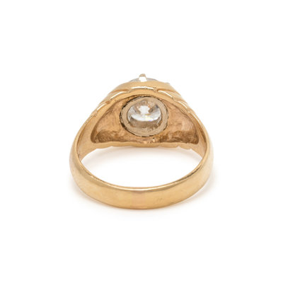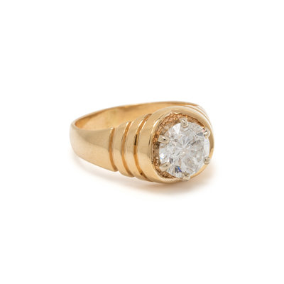 Containing one round brilliant cut diamond weighing 3.31 carats. Mounted in yellow gold. Ring size 11 3/4.