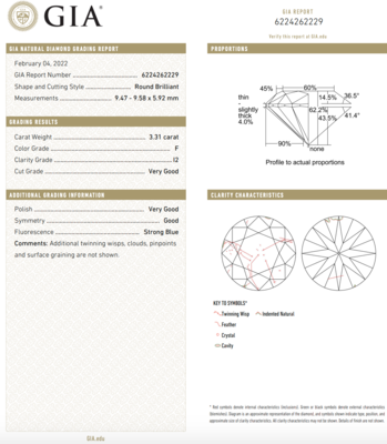 GIA, 2022, Report No. 6224262229, 3.31 carats, F color, I2 clarity, Strong blue fluorescence
