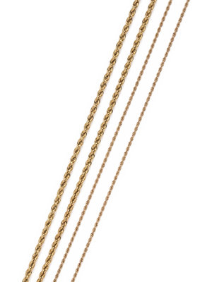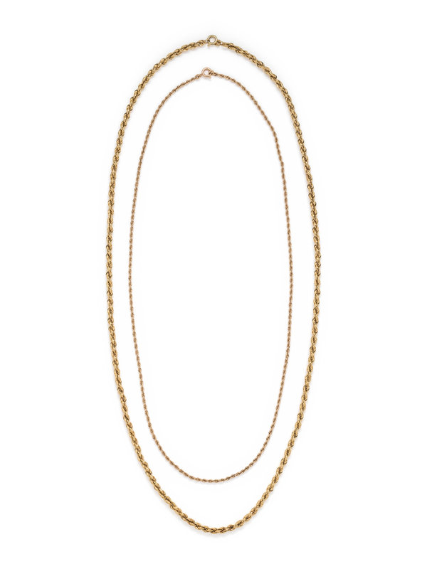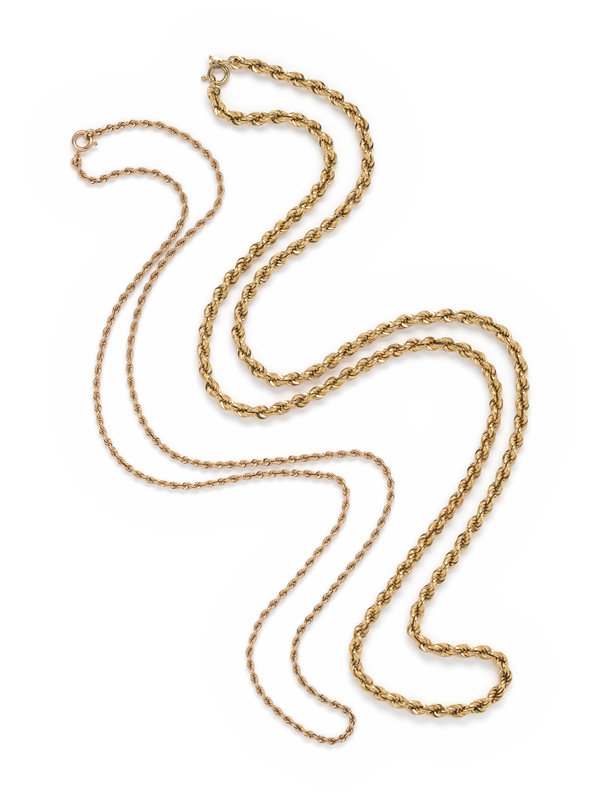 Consisting of a rope chain measuring approximately 4.00 mm wide, together with a rope chain measuring approximately 2.00 mm wide. 30 and 24 3/4 inches long.