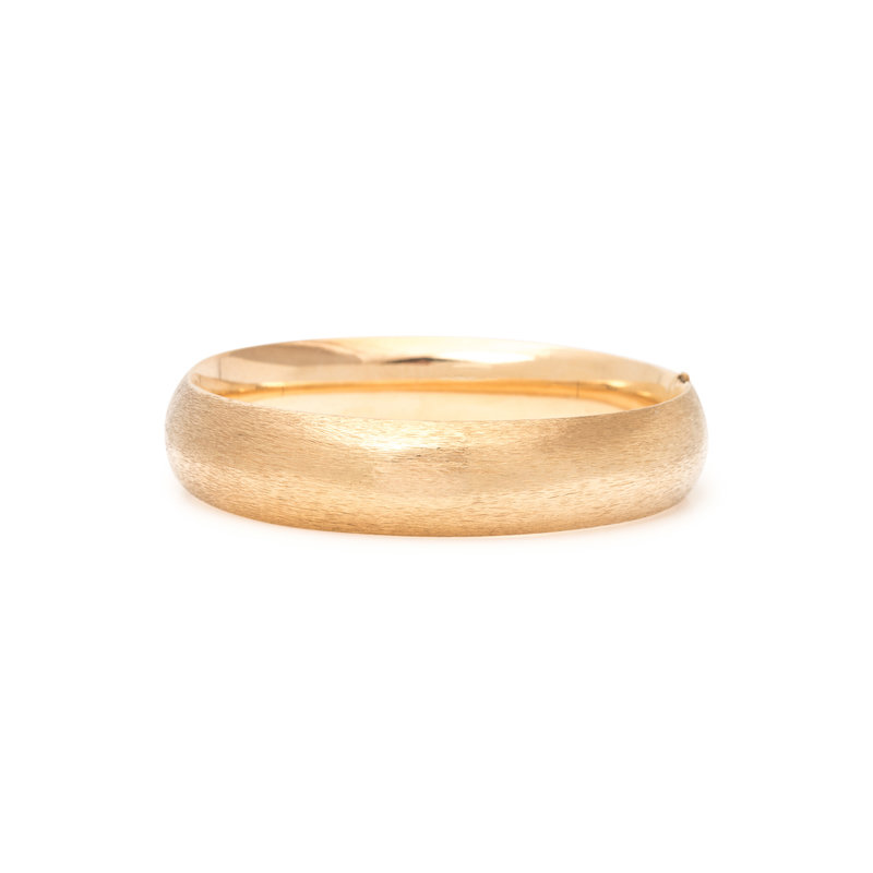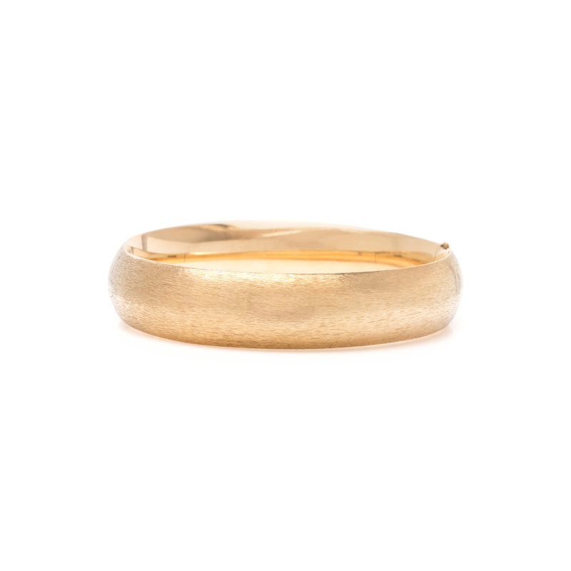 Consisting of a textured bangle measuring approximately 14.00 mm wide, hinged with side clasp. 6 5/8 inches inner circumference.