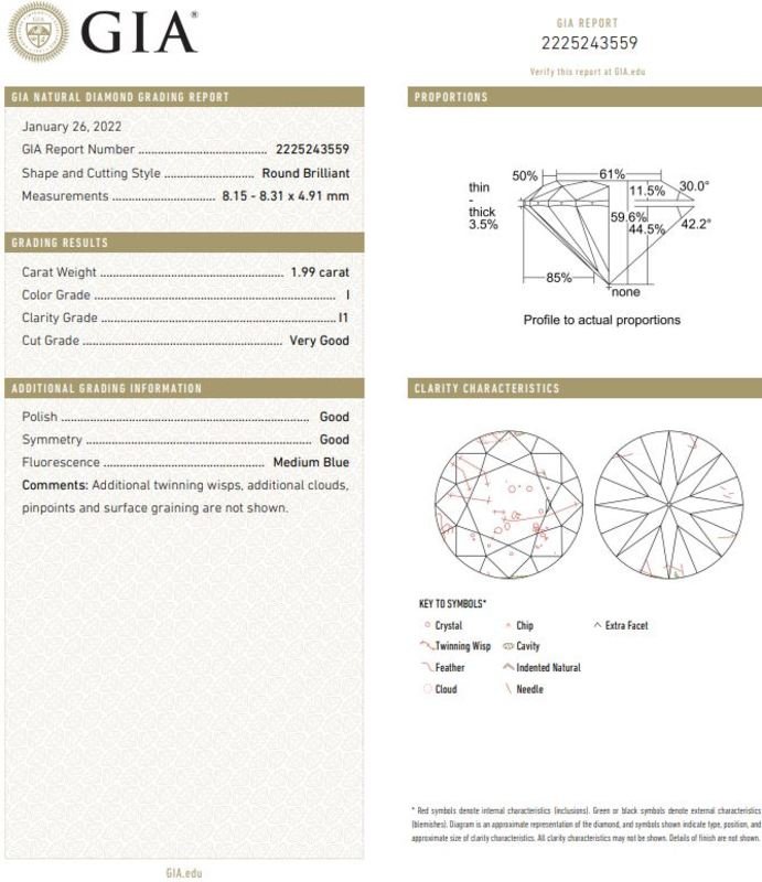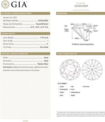 GIA, 2022, Report No. 2225243559, 1.99 carats, I color, I1 clarity, Medium blue fluorescence