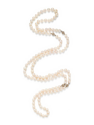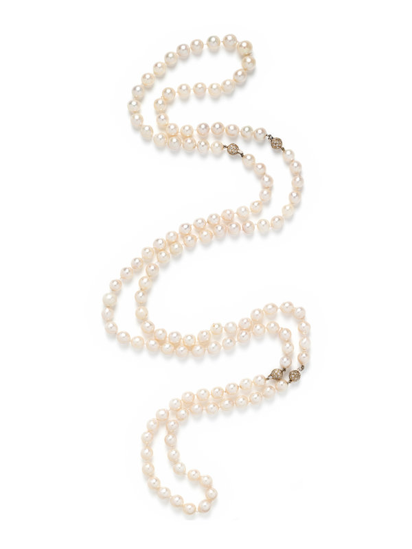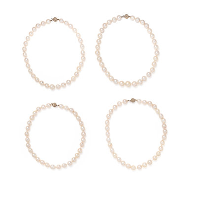 Containing numerous out of round pearls measuring approximately 8.85-11.40 mm in diameter, strung knotted with four white gold and diamond clasps, allowing the necklaces to be worn as four separate necklaces or combined. 15 inches long each.
