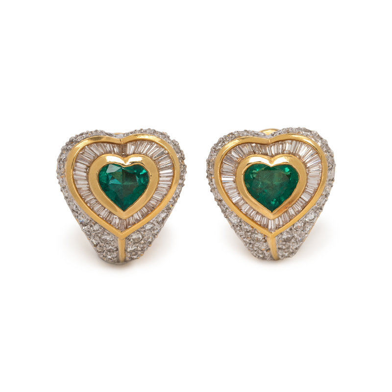 Containing two heart mixed cut emeralds measuring approximately 7.00 x 7.85 mm and numerous tapered baguette and round brilliant cut diamonds weighing approximately 3.50 carats total, posts with clip backs. Mounted in bicolor gold. 13/16 inch long.