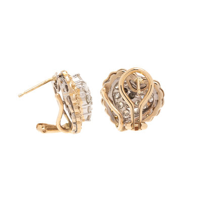 Containing 34 round brilliant cut diamonds weighing approximately 1.30 carats total and 36 round brilliant cut yellow diamonds (origin of color not tested) weighing approximately 0.20 carat total, posts with clip backs. Mounted in bicolor gold. 1/2 inch long.