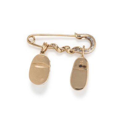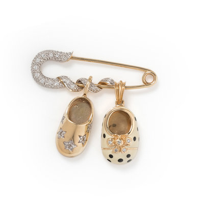 Consisting of a safety pin brooch containing 15 round brilliant cut diamonds suspending a white and black enamel shoe pendant containing five round brilliant cut diamonds and a shoe pendant containing five round brilliant cut diamonds. 1 1/2 x 1 1/4 inches.
