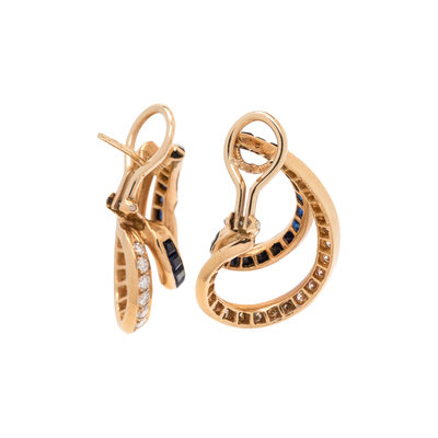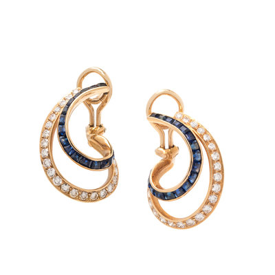 Containing 44 round brilliant cut diamonds weighing approximately 1.30 carats total and 34 calibre cut sapphires, posts with clip backs. Mounted in yellow gold. 1 inch long.