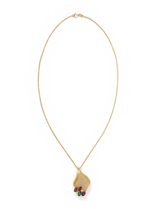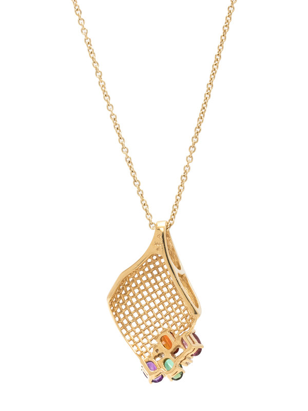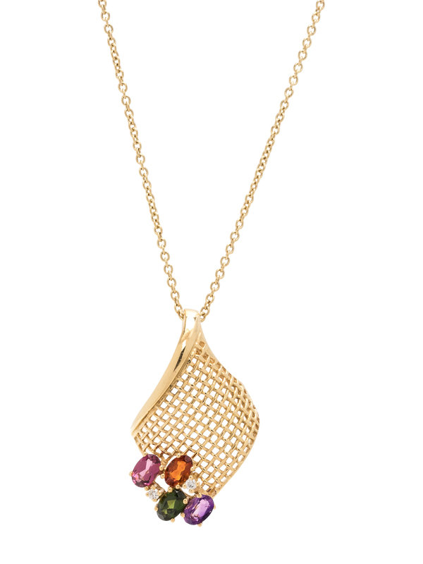 Consisting of a curved basketweave pendant containing four oval mixed cut gemstones of various colors and two round brilliant cut diamonds, suspended from a cable link chain necklace. 17 1/2 inches long.