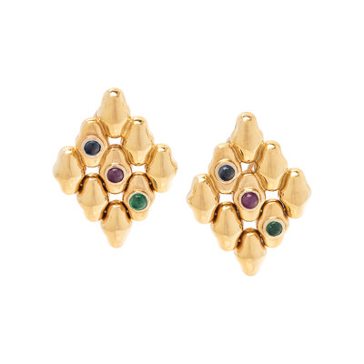 In a flexible link design, containing two cabochon cut rubies, two sapphires and two emeralds, posts with clip backs. 1 1/4 inches long.