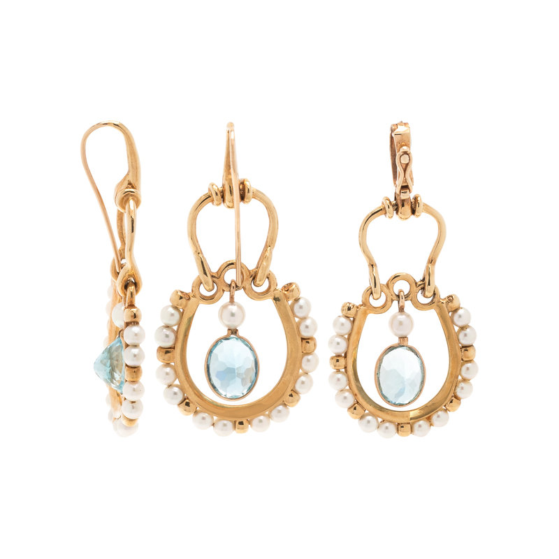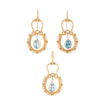 Consisting of a pair of earrings containing two oval mixed cut aquamarines and 26 pearls, together with a pendant containing one oval mixed cut aquamarine and 13 pearls. Earrings: 2 inches long. Pendant: 2 1/8 inches long.