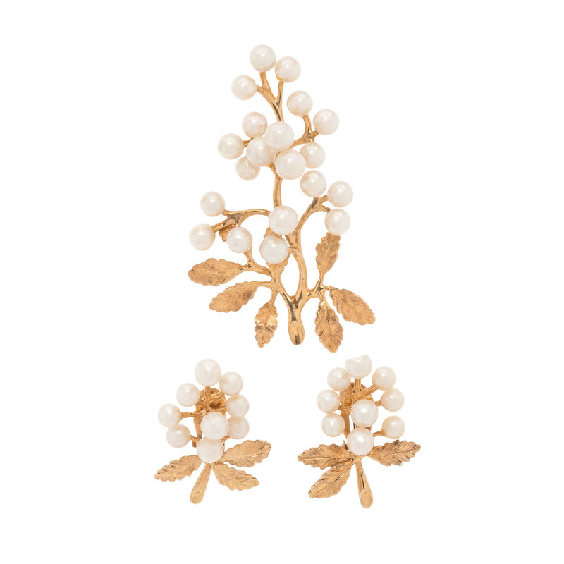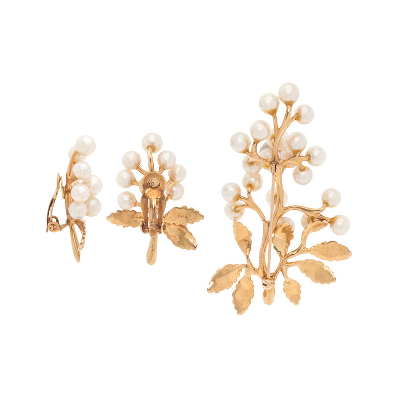 YELLOW GOLD AND CULTURED PEARL GRAPE MOTIF SET