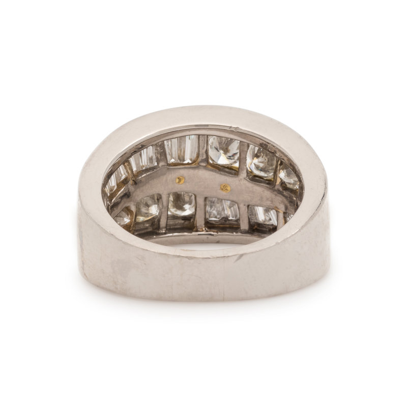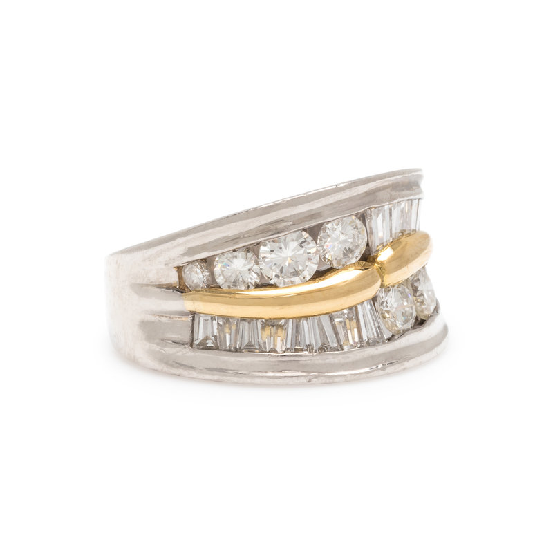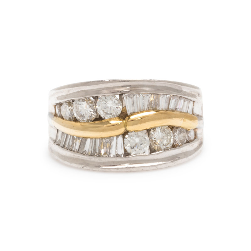 Containing eight round brilliant cut diamonds weighing approximately 1.45 carats total and 16 tapered baguette cut diamonds weighing approximately 1.10 carats total. Mounted in platinum and yellow gold. Ring size 8.
