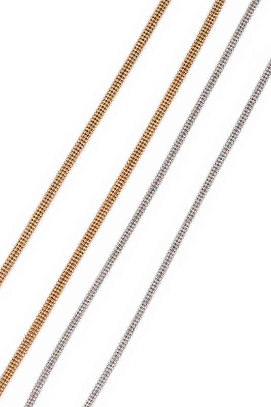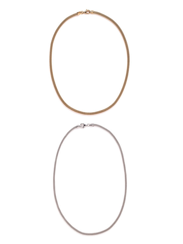 Consisting of white and yellow gold round ball chain necklaces. 16 inches long.