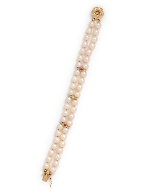 Consisting of two strands of pearls measuring approximately 6.35 mm in diameter with three gem and diamond set spacers with diamond and yellow gold clasp. 6 1/2 inches long.