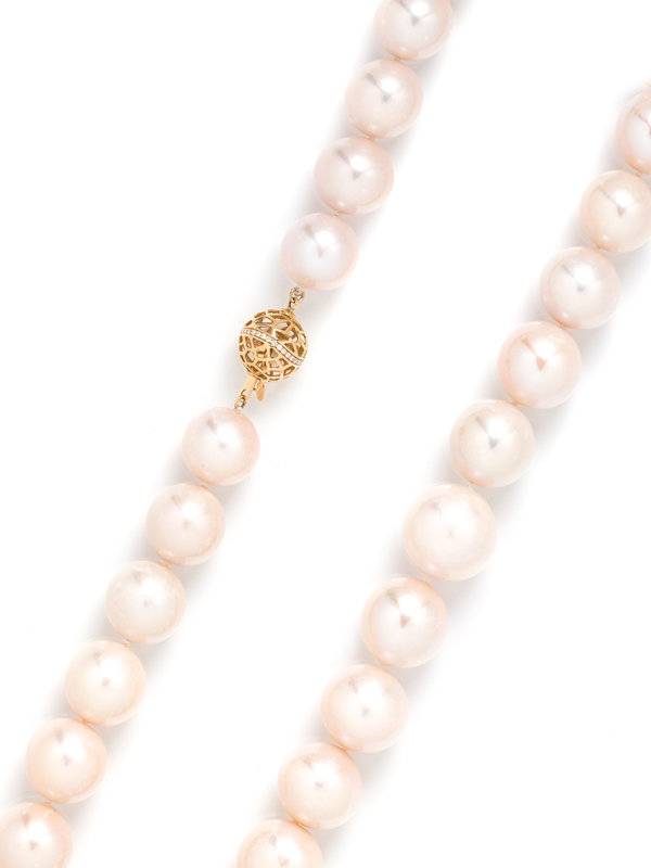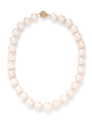 Containing graduating South Sea pearls measuring approximately 13.40-16.00 mm in diameter, strung knotted with a yellow gold and diamond clasp. 17 inches long.
