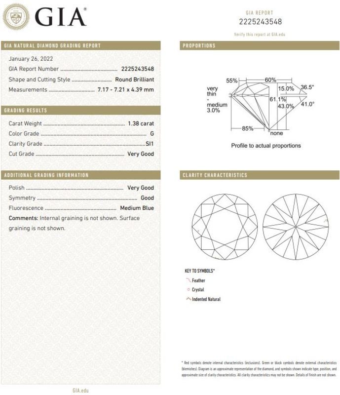 GIA, 2022, Report No. 2225243548, 1.38 carats, G color, SI1 clarity, Medium blue fluorescence