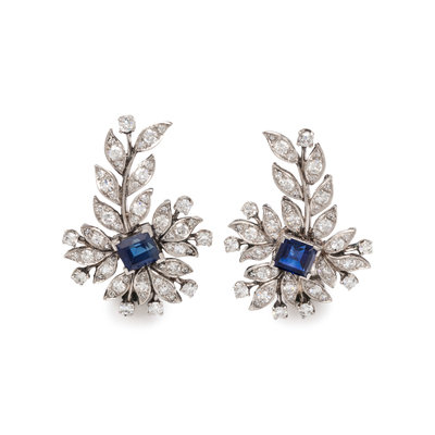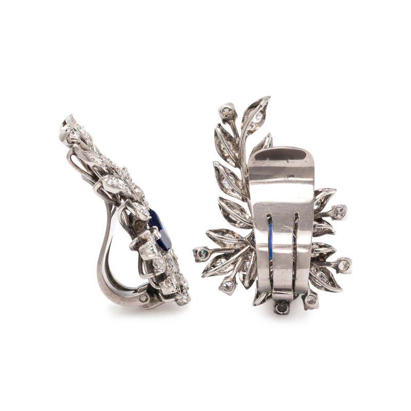 Containing two rectangular step cut sapphires and 112 single cut diamonds. Mounted in platinum. 1 inch long.