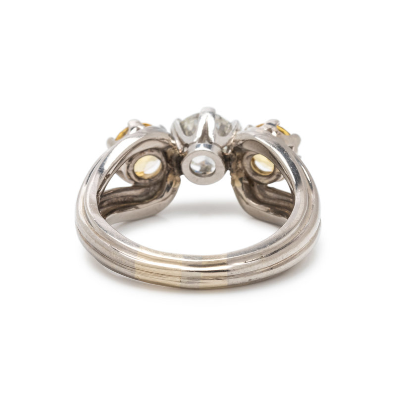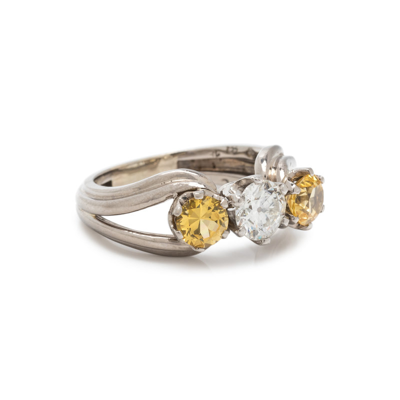 Containing one old European cut diamond weighing approximately 0.95 carat and two round brilliant cut yellow sapphires measuring approximately 5.50 mm in diameter. Mounted in white gold. Ring size 7 3/4.