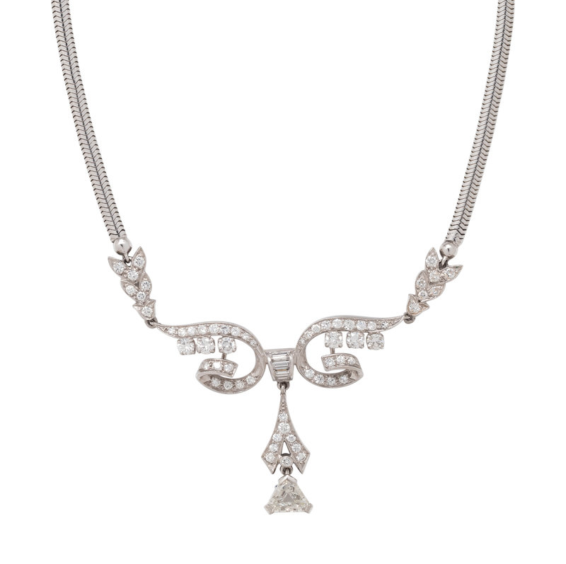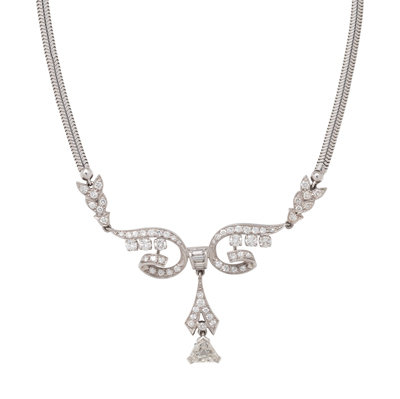 Containing one triangular step cut diamond weighing approximately 0.65 carat, 61 round brilliant and single cut diamonds and four baguette cut diamonds weighing approximately 1.65 carats total, suspended from a white gold snake chain. 14 inches long.