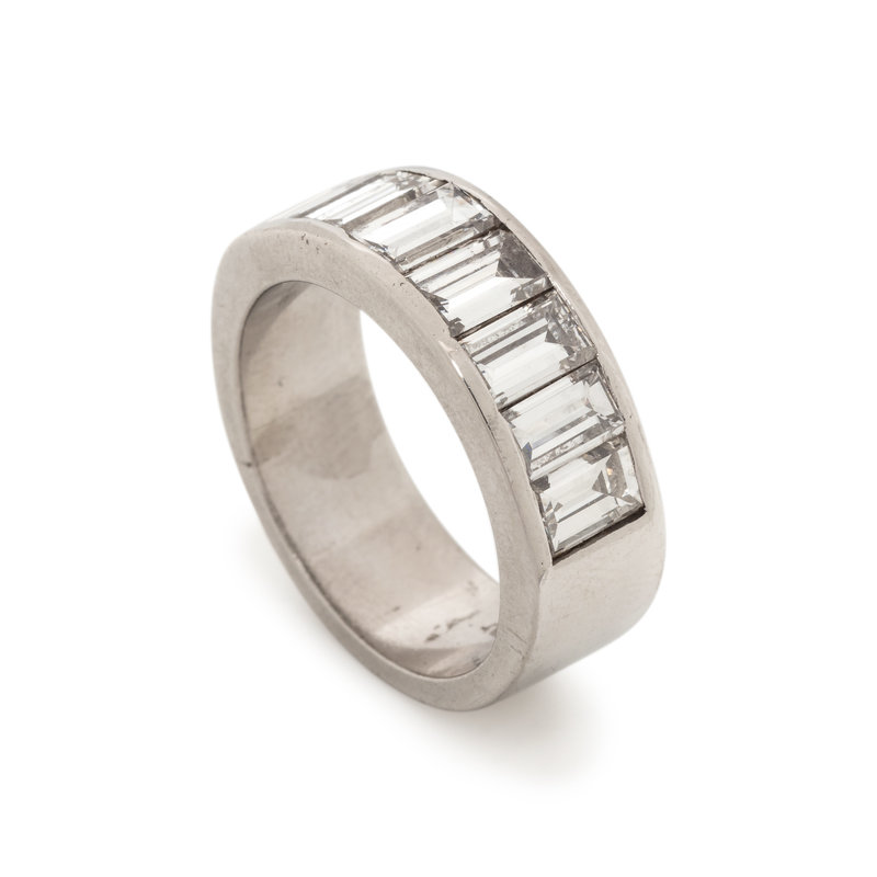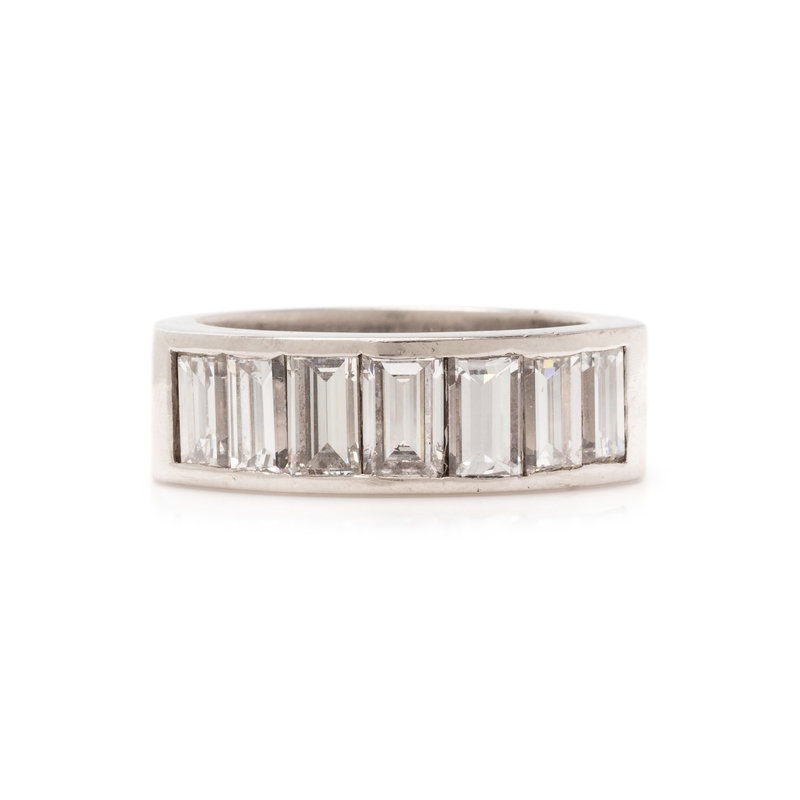 Containing seven rectangular step cut diamonds weighing approximately 2.10 carats total. Ring size 7.