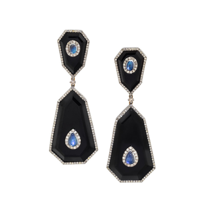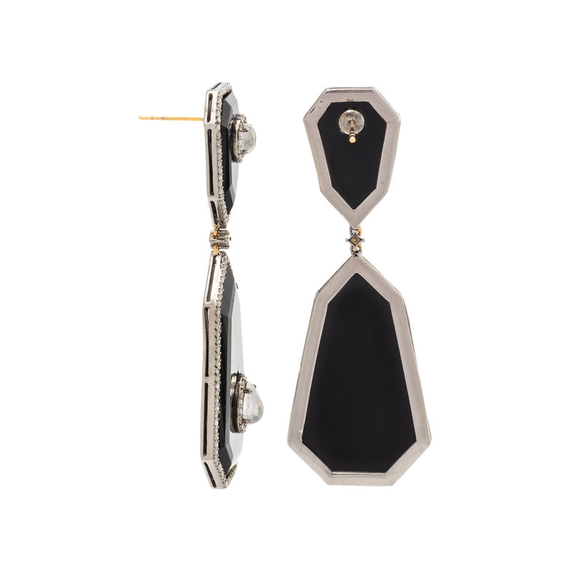 BLACK ONYX, MOONSTONE AND DIAMOND EARRINGS