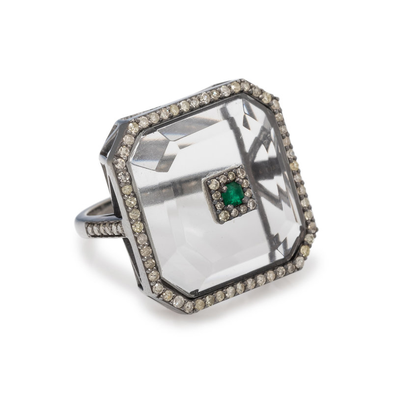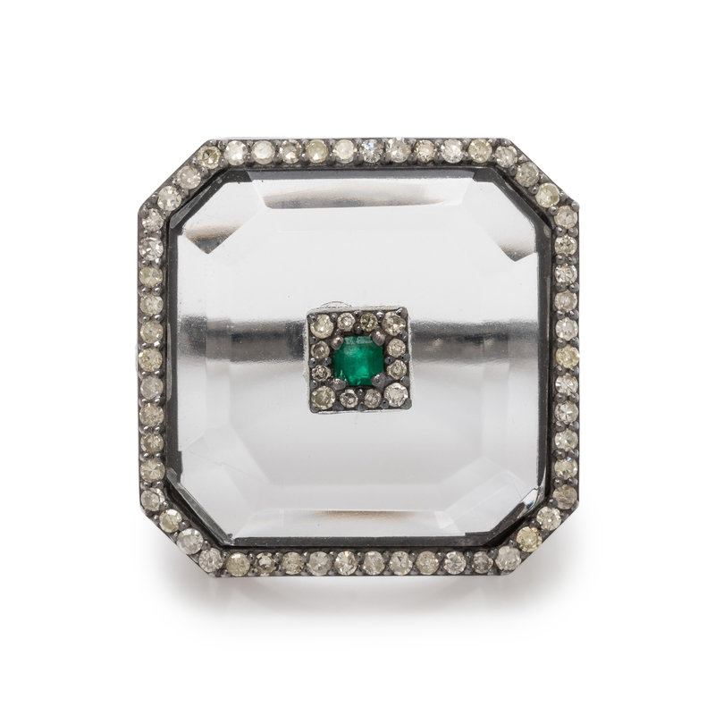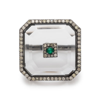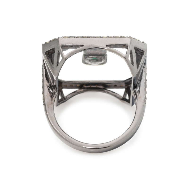 Containing one octagonal resin plaque, one emerald cut emerald and numerous single cut diamonds. Mounted in silver. Ring size 6 1/2.