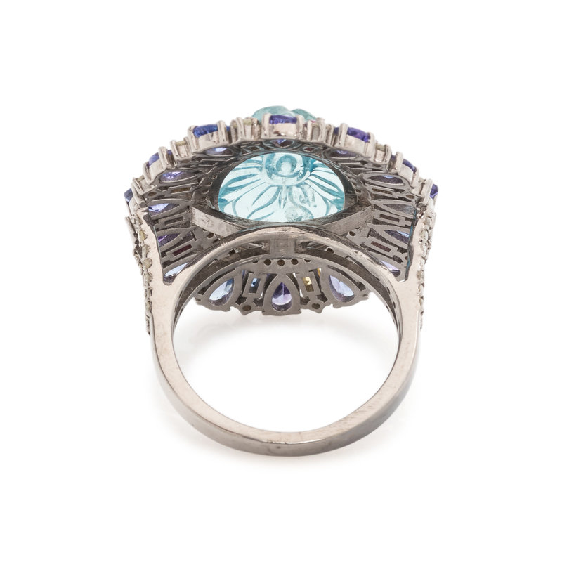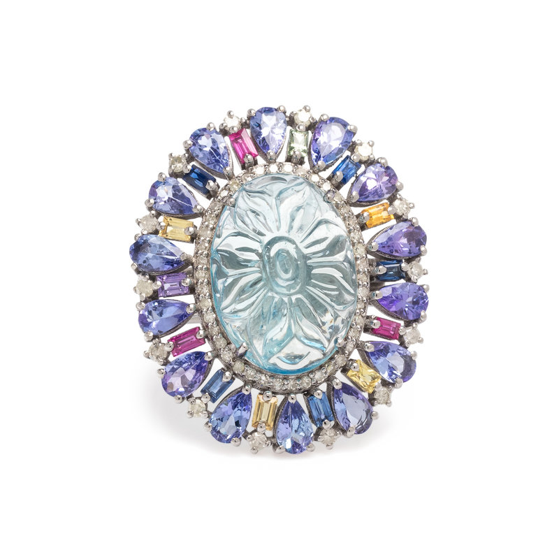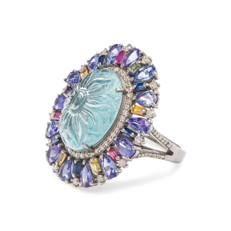 Containing one oval carved aquamarine measuring approximately 16.55 x 11.85 mm, 14 pear mixed cut tanzanites, 14 rectangular gemstones of various colors and numerous single cut diamonds. Mounted in silver. Ring size 6 3/4.