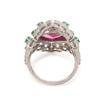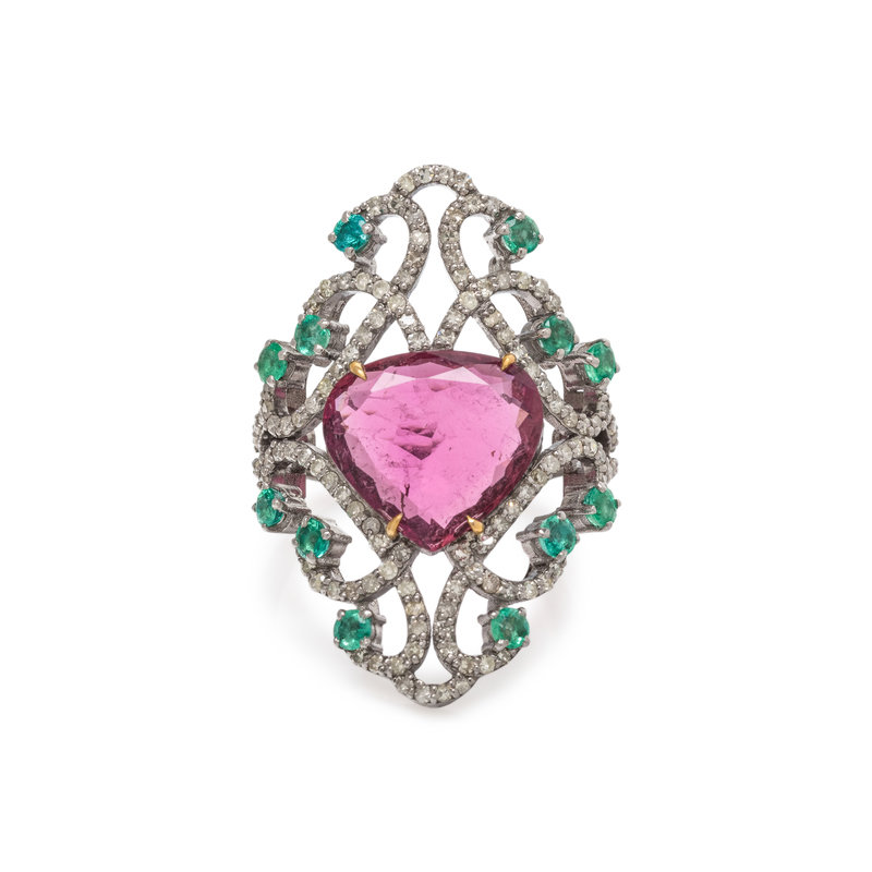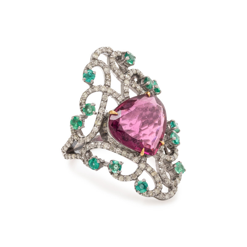 PINK TOURMALINE, EMERALD AND DIAMOND RING
