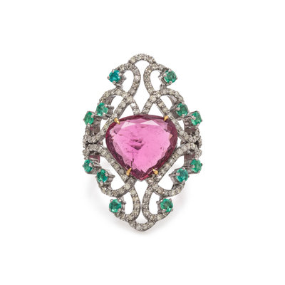 Containing one pear mixed cut pink tourmaline measuring approximately 12.10 x 13.05 mm, 12 round mixed cut emeralds and numerous single cut diamonds. Mounted in silver. Ring size 7 1/4.