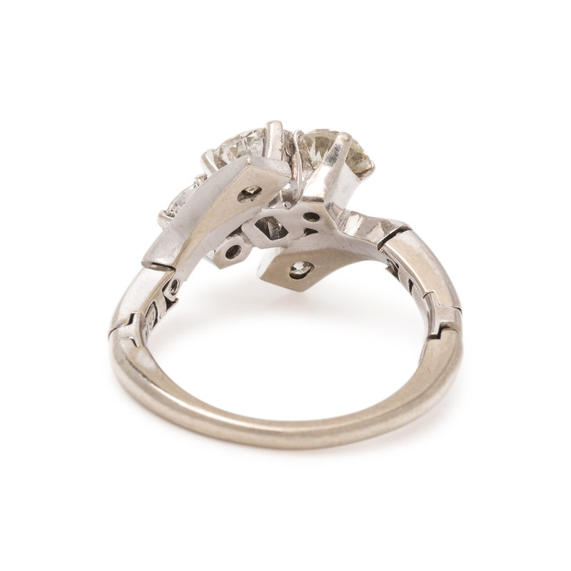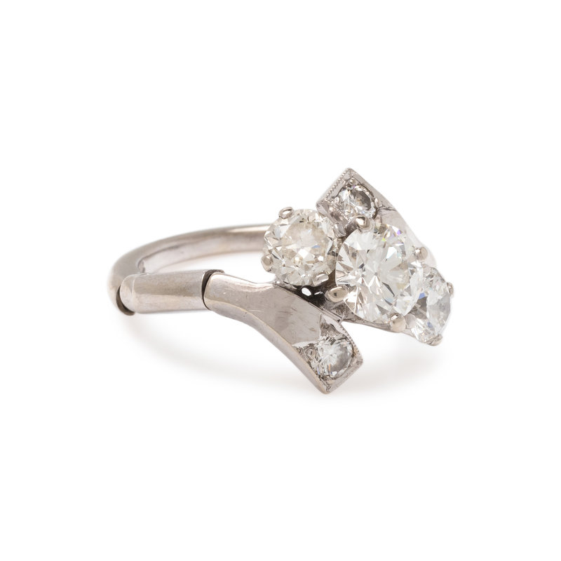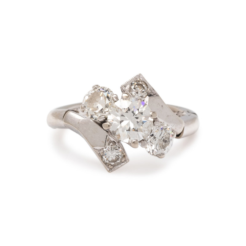 Containing one transitional cut diamond weighing approximately 0.99 carat, two transitional and two round brilliant cut diamonds weighing approximately 1.15 carats total. Mounted in white gold. Ring size 7 1/2.