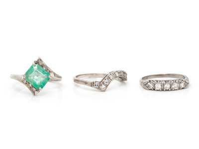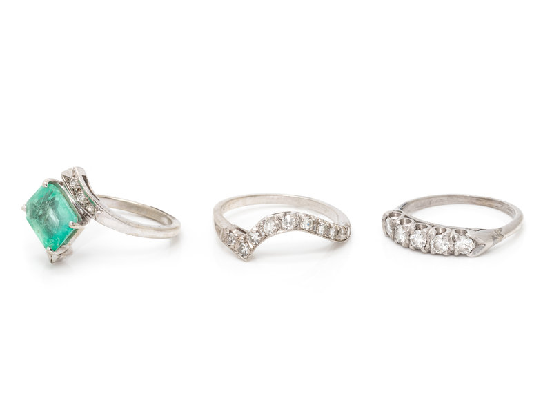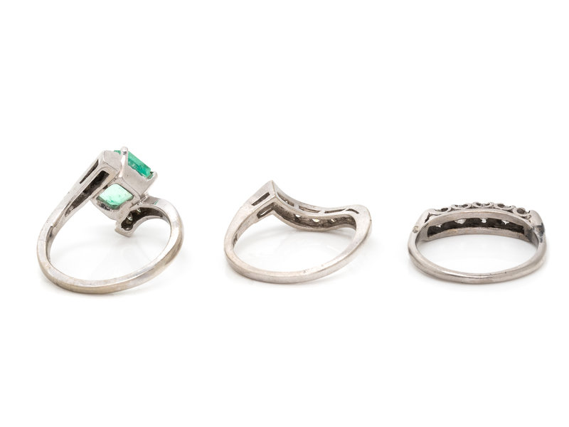Consisting of a white gold ring containing one emerald cut emerald measuring approximately 8.75 x 7.40 x 4.00 mm and six single cut diamonds, a white gold ring containing 11 single cut diamonds together with a platinum ring containing five transitional cut diamonds weighing approximately 0.40 carat total. Ring sizes 6 3/4; 6 1/4; 5 1/2.