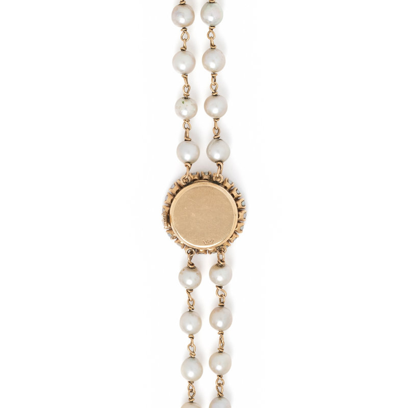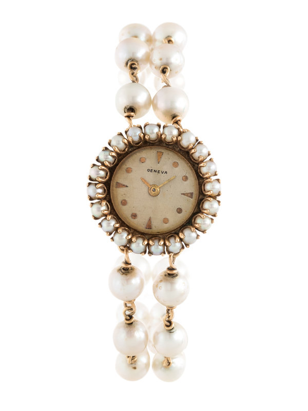 22.00 mm case diameter, the bezel containing 20 seed pearls, matte silvered dial, applied dot and dagger numerals, 17 jewel manual wind movement signed LOUVIC WATCH INC SWISS, double strand cultured pearl wire link bracelet, box clasp containing one pearl. 6 3/4 inches long.