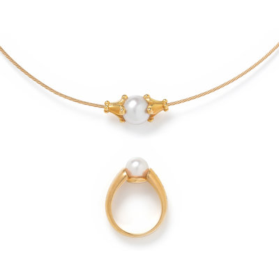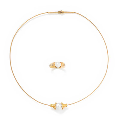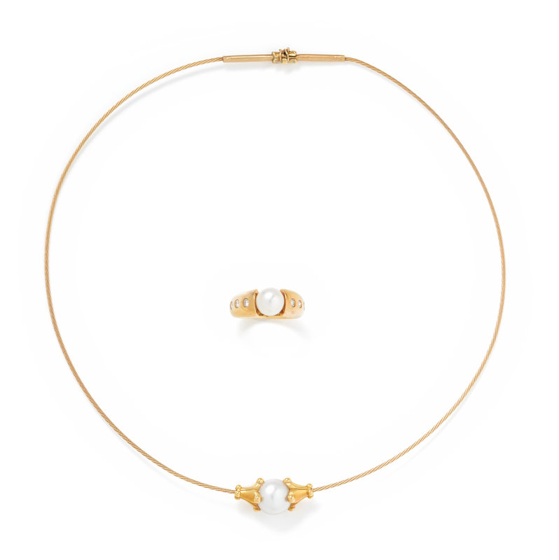 Consisting of a necklace by Paul Morelli containing one pearl bead measuring approximately 10.80 mm in diameter and suspended from a gold cord necklace, together with a ring containing one pearl measuring approximately 8.30 mm in diameter and six round brilliant cut diamonds weighing approximately 0.25 carat total. Necklace: 16 1/2 inches long. Ring size 7 1/4.
