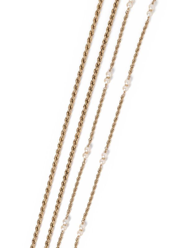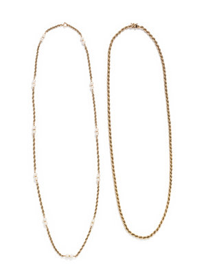 Consisting of a rope chain necklace interspersed with pearl stations, together with a rope chain necklace. 30 1/2 and 28 1/4 inches long.