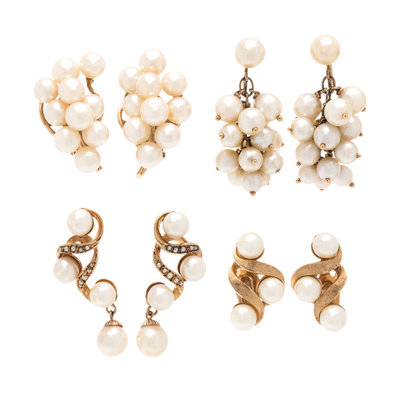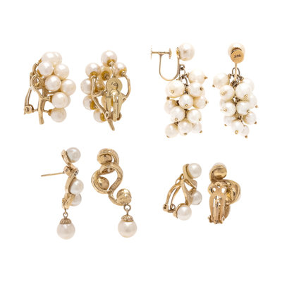 Consisting of four pairs of earclips and one pair of earrings containing pearls measuring approximately 4.65-7.70 mm in diameter.
