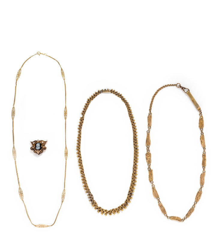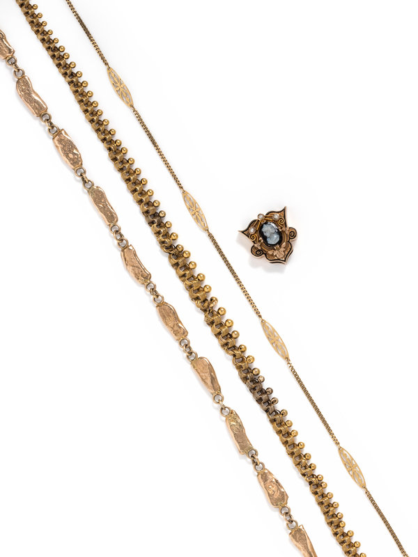 Consisting of a freeform gold link fob chain, a graduated fancy link chain with spherical detail, a curb link chain with openwork stations together with a cameo, seed pearl and enamel slide. 18 1/2-24 1/2 inches long.