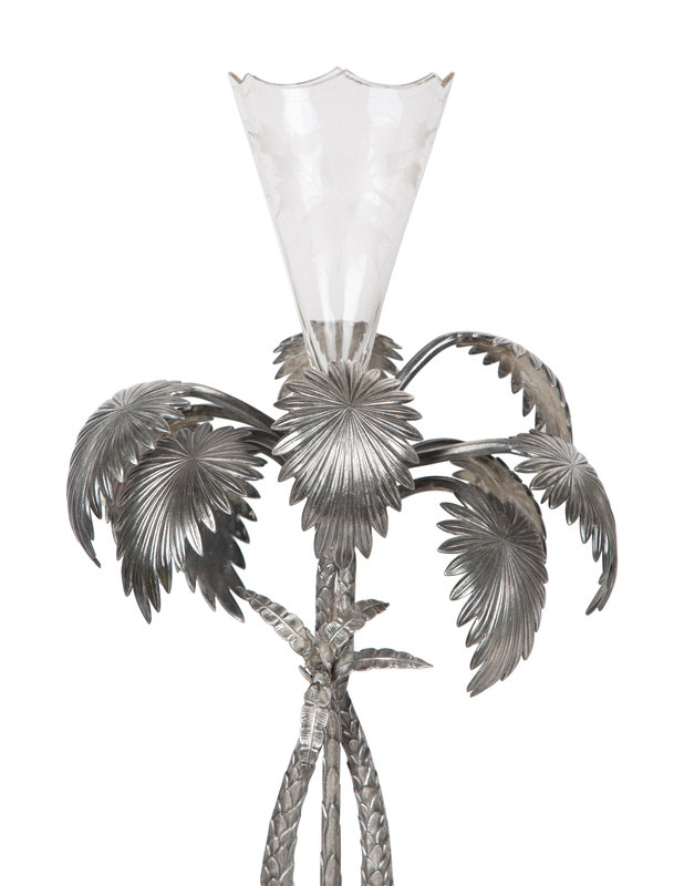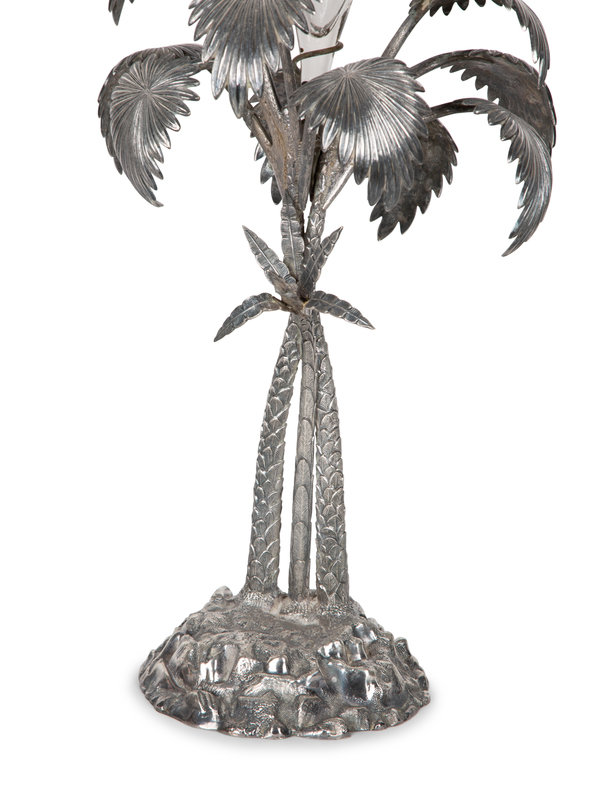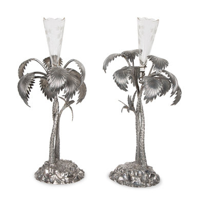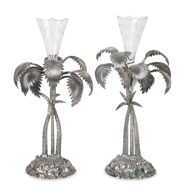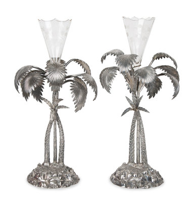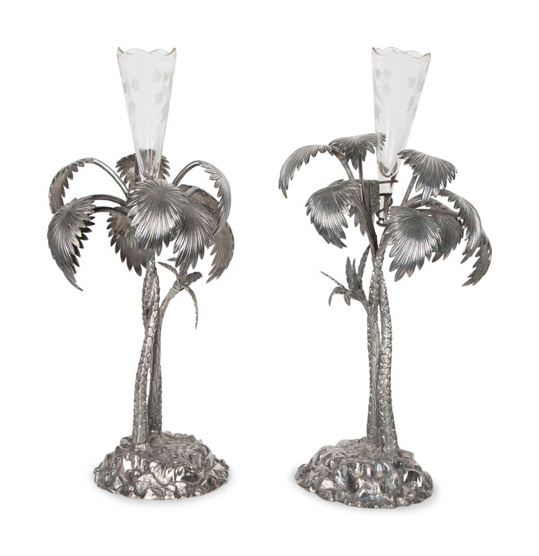 Pair of French Palm Tree-Form Silvered Bronze and Glass Centerpieces