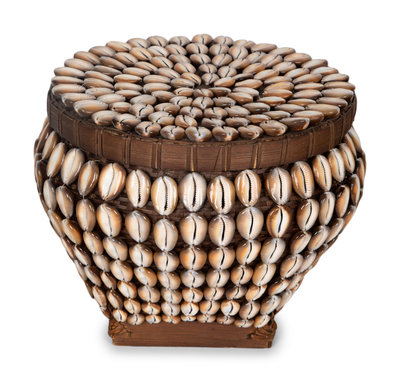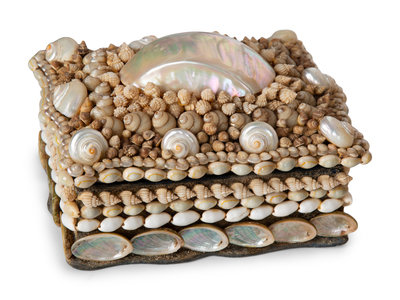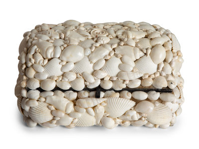 Two French Shell-Encrusted Lidded Boxes and a Pair of Cowry Shell Covered Baskets