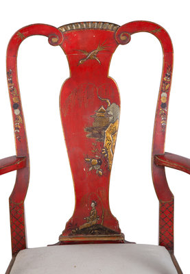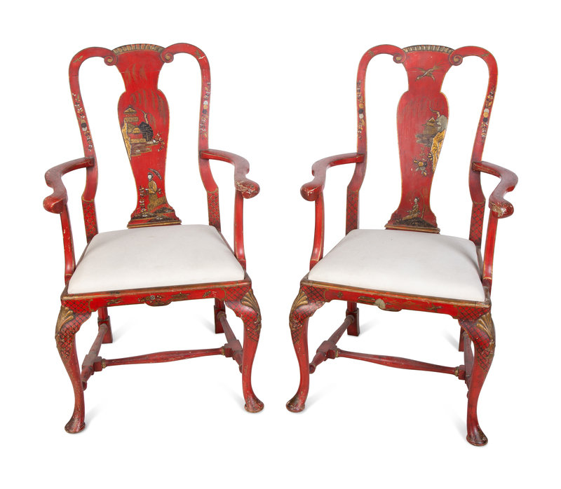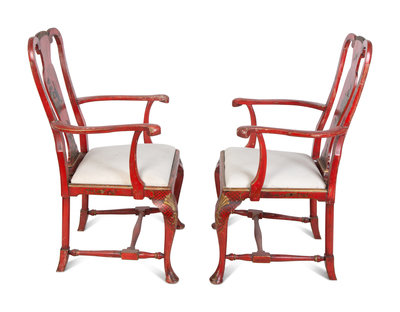 A Pair of Queen Anne Style Red Lacquer and Parcel Gilt Armchairs