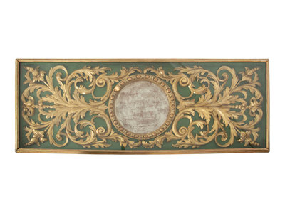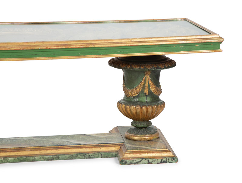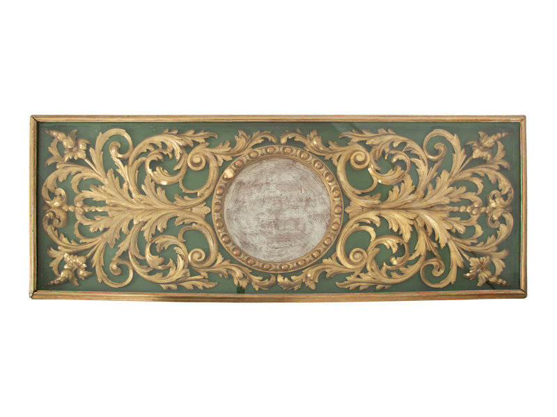 having a glass top enclosing a carved giltwood decorative panel.