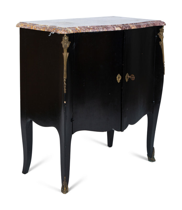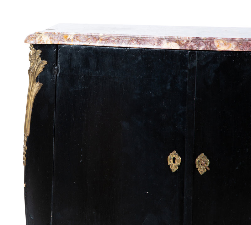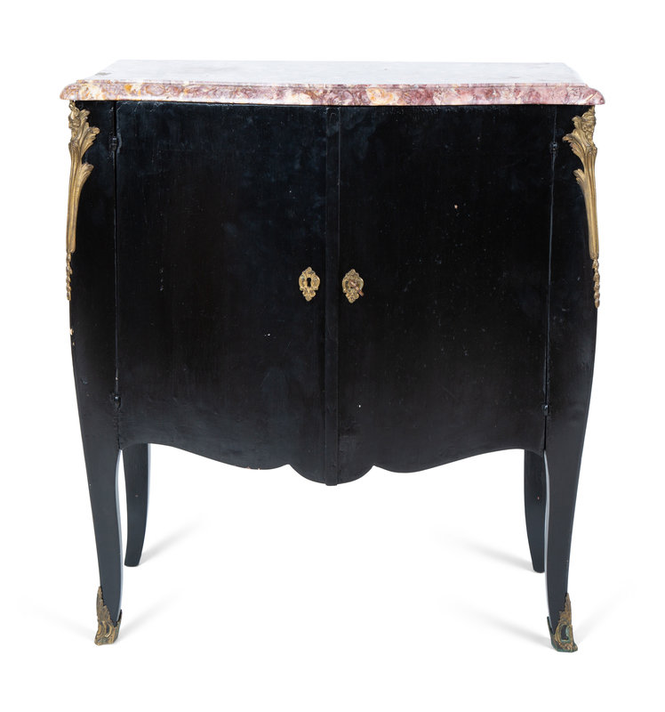 A Transitional Louis XV/XVI Style Gilt Bronze Mounted Ebonized Marble-Top Commode